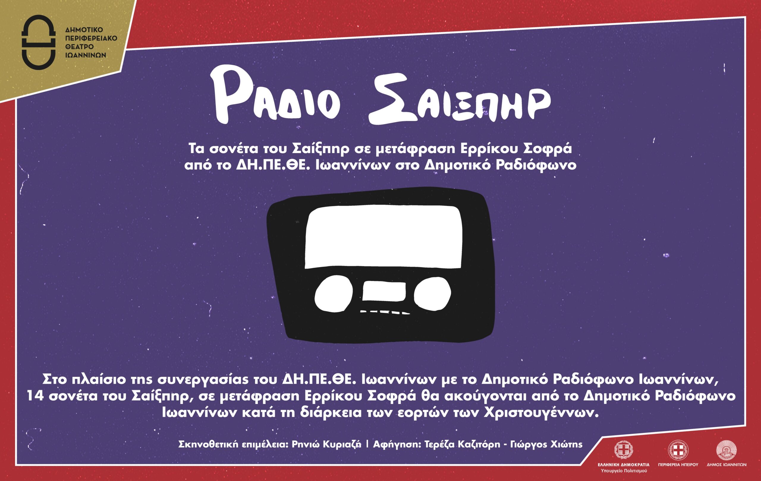 Στο πλαίσιο της συνεργασίας του ΔΗ.ΠΕ.ΘΕ. Ιωαννίνων με το Δημοτικό Ραδιόφωνο Ιωαννίνων, 14 σονέτα του Σαίξπηρ, σε μετάφραση Ερρίκου Σοφρά θα ακούγονται από το Δημοτικό Ραδιόφωνο Ιωαννίνων κατά τη διάρκεια των εορτών των Χριστουγέννων. Σκηνοθετική επιμέλεια: Ρηνιώ Κυριαζή, Αφήγηση: Τερέζα Καζιτόρη-Γιώργος Χιώτης