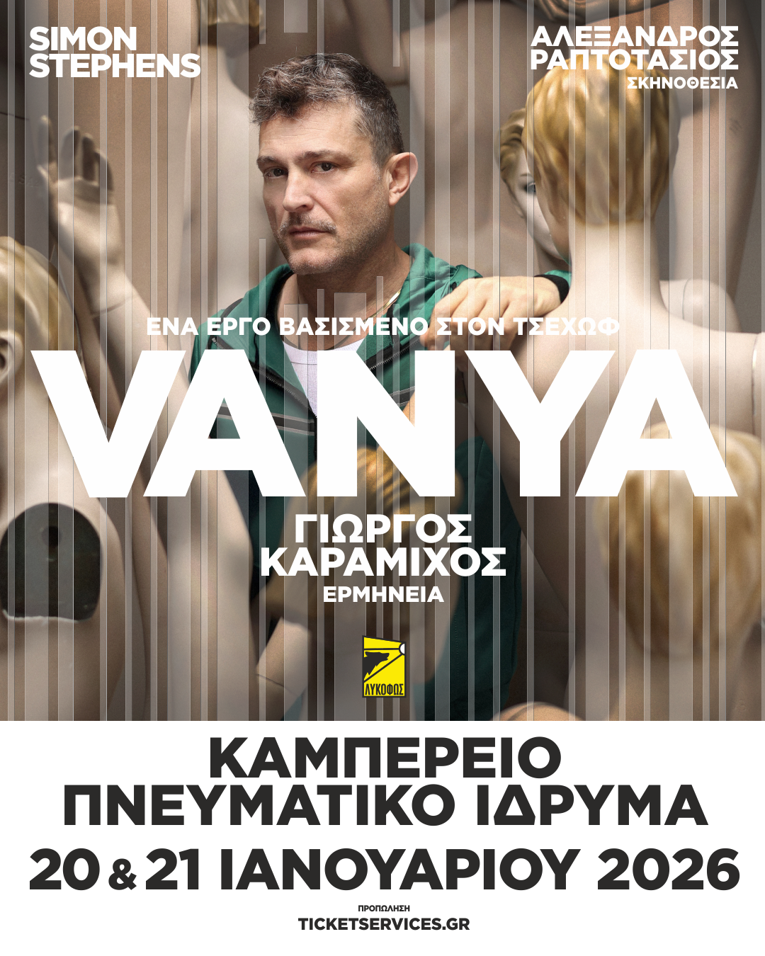 Ο σημαντικός Έλληνας ηθοποιός αναμετράται επί σκηνής, υπό τη σκηνοθετική καθοδήγηση του Αλέξανδρου Ραπτοτάσιου, με τον VANYA του πολυβραβευμένου Simon Stephens, ιδιαίτερα αγαπητού στη χώρα μας από το σπουδαίο θεατρικό του έργο Ποιος σκότωσε τον σκύλο τα μεσάνυχτα. Η σύγχρονη και συμπυκνωμένη εκδοχή του γνωστού έργου του Αντόν Τσέχωφ, προκαλεί έναν ηθοποιό να υποδυθεί οκτώ ρόλους, ακροβατώντας ανάμεσα στην κωμωδία και την τραγωδία χαρακτήρων που θέλουν απεγνωσμένα να αλλάξουν τις ζωές τους.